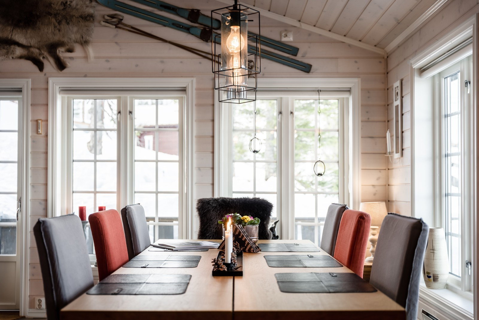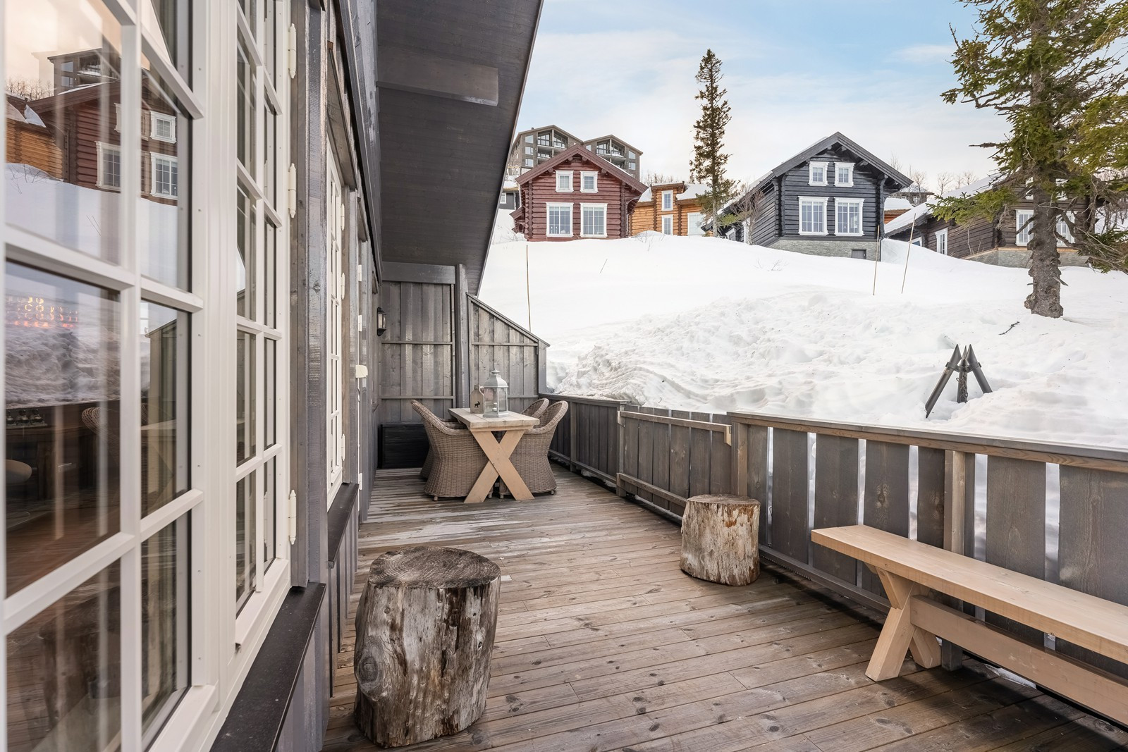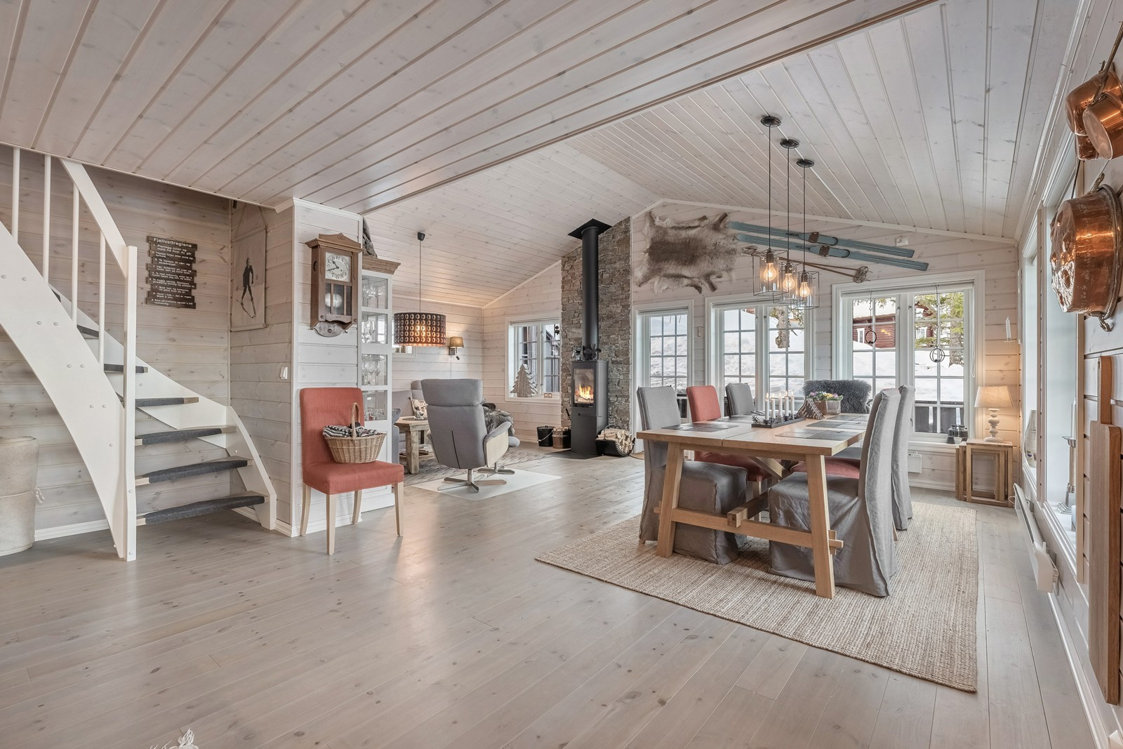 This spacious 130 sqm cabin with ski in/ski out* is perfect for accommodating up to 12 guests and boasts 5 cozy bedrooms, an open kitchen- and living room area with a fireplace, separate TV-room and Wi-Fi**. The fully equipped kitchen features kitchen utensils, stove, refrigerator/freezer, ...